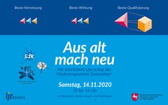 Um den Übergang bzw. die Weiterentwicklung zwischen den beiden Förderprogrammen öffentlich sichtbar zu machen, gleichzeitig die Erfolge der zurückliegenden Förderperiode und die an diesen Erfolgen Beteiligten aus der niedersächsischen Kinder- und Jugendarbeit zu würdigen sowie den Abschluss des Förderprogramms Generation³ zu feiern, findet am 14.11.2020 von 10 bis 16 Uhr an den 4 Standorten Hannover, Lingen, Stade und Göttingen in hybrider Form und via Live-Schaltung dieses „feierliche Upcycling“ im Förderprogramm statt.