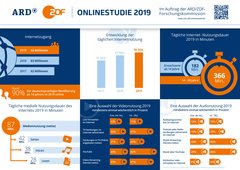 Die ARD/ZDF-Onlinestudie 2019 wurde im Rahmen der "Studienreihe Medien und ihr Publikum (MiP)" und im Auftrag der ARD/ZDF-Forschungskommission durchgeführt. Die Ergebnisse beruhen auf dem fusionierten Datensatz mit den Kerndaten der Massenkommunikation Trends 2019. Im Jahr 2019 wurden in einer repräsentativen Dual-Frame-Stichprobe insgesamt 2000 deutschsprachige Personen ab 14 Jahren befragt. Die Feldarbeit wurde erstmals vom Institut Kantar durchgeführt und dauerte von Ende Januar bis Mitte April 2019. Eine ausführliche Analyse der Daten ist in der neuesten Ausgabe der Fachzeitschrift "Media Perspektiven" (Heft 9/2019) dokumentiert. Außerdem werden mit dieser Pressemeldung eine Infografik (PDF oder JPG) und ein 16-seitiges PDF mit den wichtigsten Ergebnissen veröffentlicht, die wie die Fachartikel auf der Website www.ard-zdf-onlinestudie.de bereitgestellt werden.