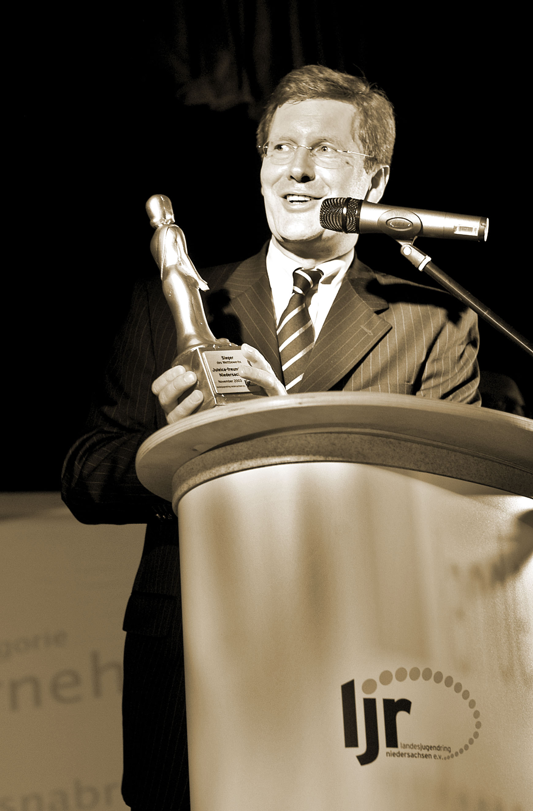 Ministerpräsident Christian Wulff bei der Übergabe der »goldenen Juleica« im Rahmen der Siegerehrung am 24.11.2003