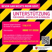 Das Unterstützungssystem für den Kinderschutz in Niedersachsen steht mit den vielen Beratungs- und Unterstützungsangeboten weiter zur Verfügung. Auf der Website www.kinderschutz-niedersachsen.de sind die Angebote zu finden, die in Niedersachsen zur Unterstützung von Kindern, Jugendlichen und Familien in Krisensituationen vorgehalten werden.