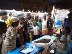 Zu den Fotos: Das Messgerät zeigt fast keinen CO2-Ausstoss. Auf einer Messe in Burkina Faso fanden die Pyrolyse-Öfen und die Verwendung der Pellets großen Anklang. Künftig sollen die Öfen vor Ort mit Lehm ummantelt werden.