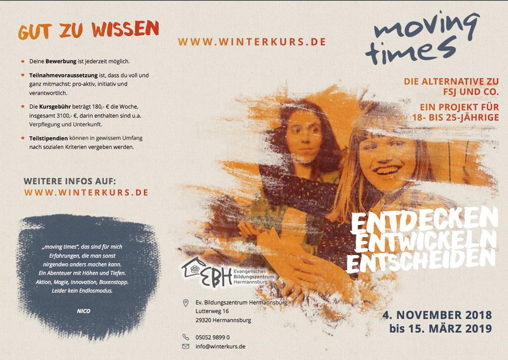 Der fünfmonatige Winterkurs des Evangelischen Bildungszentrums Hermannsburg ist für junge Leute ab 18, egal ob man bis dahin zur Schule ging, bereits berufliche Erfahrungen gesammelt hat oder gerade an einer Hochschule studiert....[mehr]