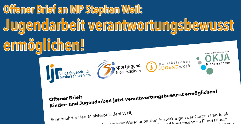 Mit einem gemeinsamen offenen Brief haben sich der Landesjugendring Niedersachsen e.V., die Sportjugend, das Paritätische Jugendwerk und die Landesarbeitsgemeinschaft offene Kinder- und Jugendarbeit an Ministerpräsident Stephan...[mehr]