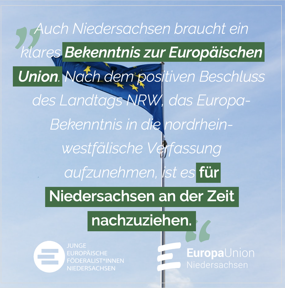 Kritische Stimmen betrachten die Verfassungsänderung als reine Symbolpolitik. Doch lebt Politik nun mal von Symbolen, die mit politischem Handeln einhergehen. Ein EU-Bekenntnis in der Verfassung wäre außerdem beides: ein klares Zeichen für Europa, aber auch ein rechtlich-bindender Vertrag, der wiederum politisches Handeln prägt. „Gelebte europäische Zusammenarbeit der Grenzregion Niedersachsen-Niederlande kann durch diese rechtliche Verbindlichkeit sichtbar gemacht, gewürdigt und für die Zukunft gestärkt werden“, ist Tobias von Gostomski, Vorstandsmitglied der überparteilichen Europa-Union Niedersachsen, überzeugt. „Mit dem Beschluss in der kommenden Landtagssitzung wird sich zeigen, ob wir in Niedersachsen die Europäische Union nicht nur im Herzen tragen, sondern auch in der Verfassung würdigen. Wir hoffen auf eine breite Mehrheit der pro-europäischen Fraktionen des Landtags, die dem Gesetzentwurf zustimmen“, ergänzt Julia Schmelter, Beisitzerin im Landesvorstand der JEF Niedersachsen.