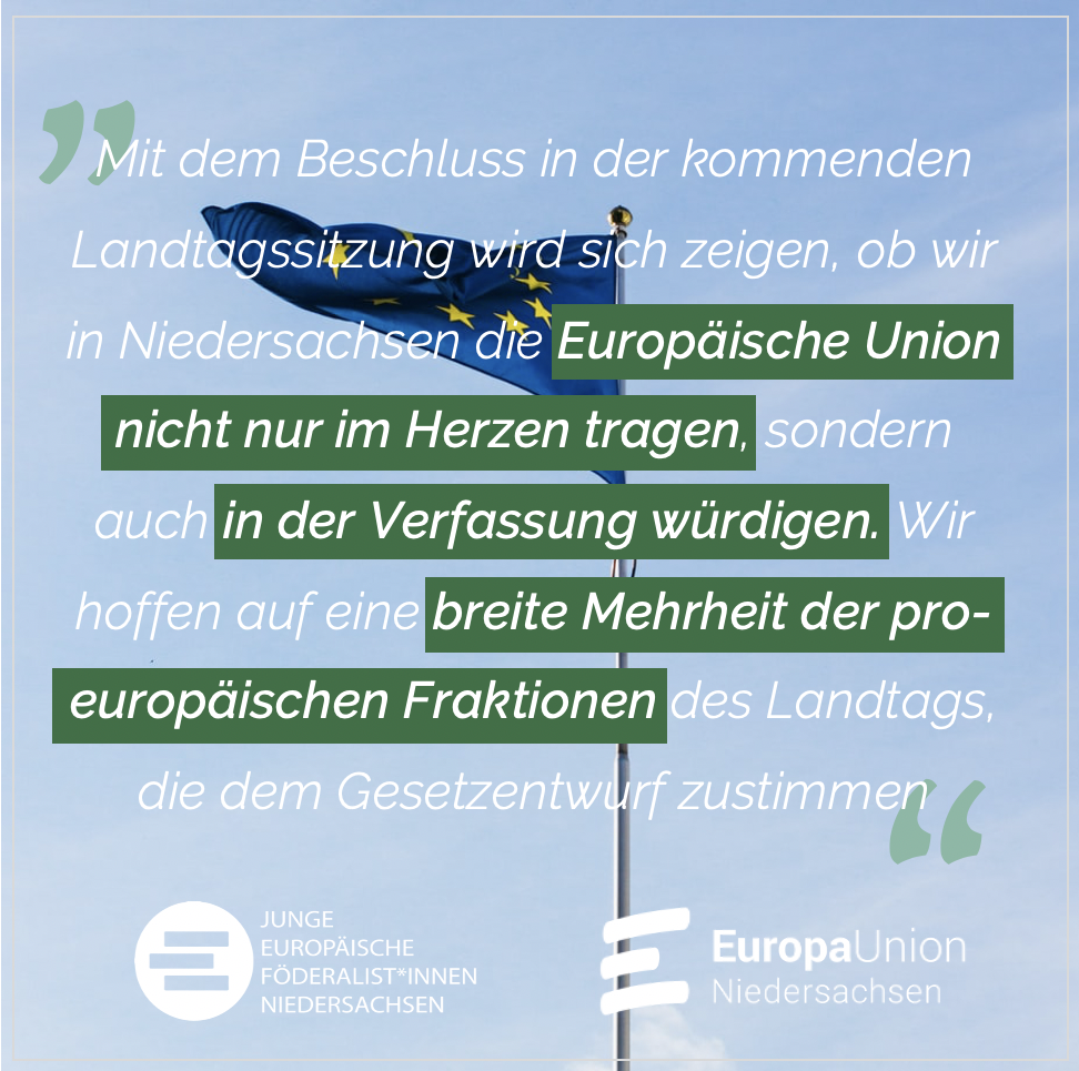 Am 30. Juni – einen Tag vor Beginn der deutschen EU-Ratspräsidentschaft – wird im Niedersächsischen Landtag über einen Gesetzentwurf der Grünen zur Ergänzung des Europabezugs in der Landesverfassung beraten. Die Änderung sieht vor, Niedersachsen nicht wie bisher nur als Teil der europäischen Völkergemeinschaft anzuerkennen, sondern aktiv an der Gestaltung der Europäischen Union mitzuwirken. Jan Hörnschemeyer, Landesvorsitzender der JEF Niedersachsen findet: „Auch Niedersachsen braucht ein klares Bekenntnis zur Europäischen Union. Nach dem positiven Beschluss des Landtags NRW, das Europa-Bekenntnis in die nordrhein-westfälische Verfassung aufzunehmen, ist es für Niedersachsen an der Zeit nachzuziehen.“