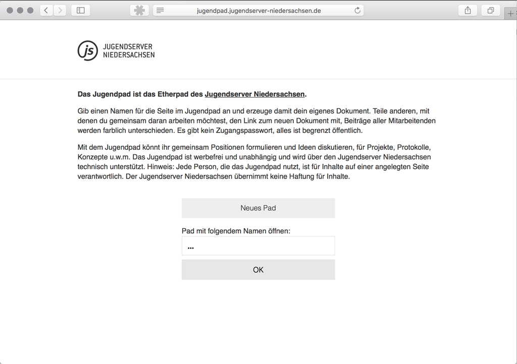 Das Jugendpad ist das Etherpad des Jugendserver Niedersachsen.