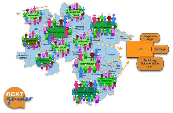 Die Verbandsvertreter-innen verständigten sich in einer Auftakt- und Fortbildungsveranstaltung am 05.02.2009 u.a. auf die Durchführung verschiedener in Niedersachsen verteilter Verbandsprojekte im Gesamtprogramm »neXTgender«, angesiedelt auf den unterschiedlichen Ebenen der Verbände und von diesen verantwortlich durchgeführt, um so möglichst viele Personen nachhaltig zu erreichen. Durchgeführt wurden in diesem Zusammenhang sowohl Projekte, die über 18 Monate dauerten, als auch Projekte, die programmbezogen über einen kürzeren Zeitraum gefördert wurden. Der Landesjugendring Niedersachsen unterstützte diese Projekte durch Veranstaltungen sowie Informationen und moderierte und vernetzte den Austausch zwischen den Projekten.