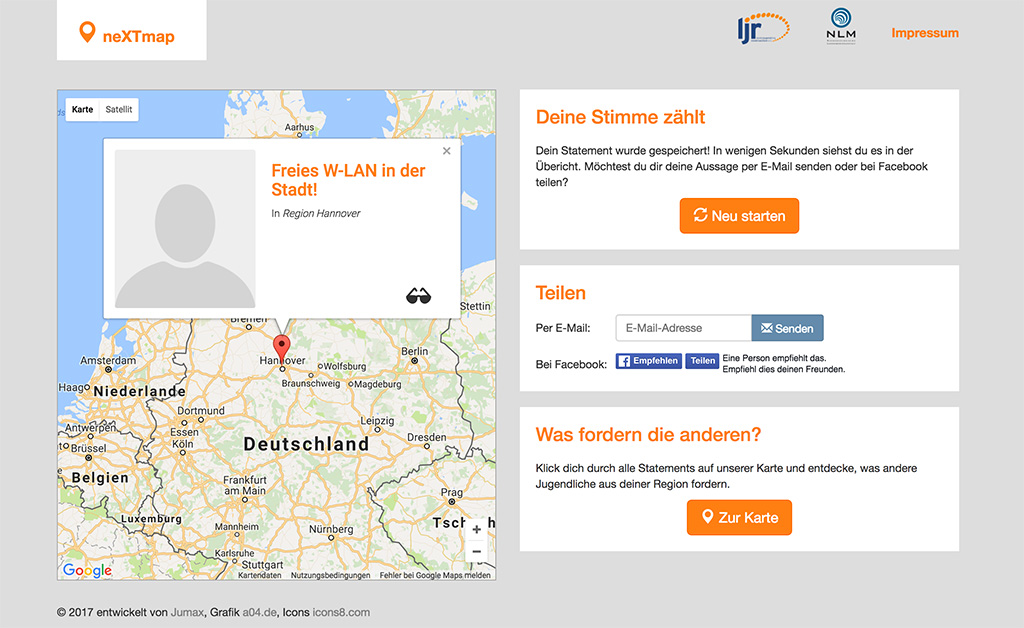 Die neXTmap ist im Rahmen der Kooperation „neXTmedia – Medienkompetenz in der Jugendarbeit” mit der Niedersächsischen Landesmedienanstalt (NLM) als e-Partizipationstool entwickelt worden. Mehr zur Kooperation und den kostenlosen Angeboten für Jugendarbeit gibt es auf neXTmedia.ljr.de.