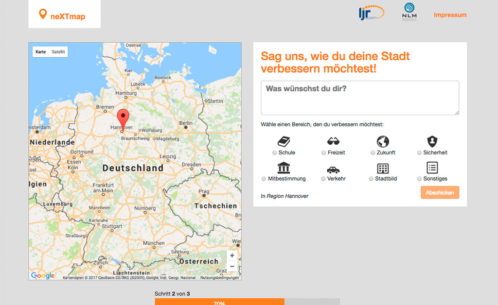 Die neXTmap ist eine offene „Beschwerde-APP”, basierend auf Google Maps. Hier können regional verortete „Verbesserungen” eingegeben werden. Die APP speichert die Eingaben und den Ort, bei Bedarf auch mit Foto, ab. Die APP ist eigenständig über den Server abzurufen und kann von Interessierten aus der Jugendarbeit als „White-Label” für eigene Umfragen genutzt werden.